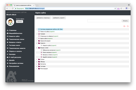 Вышла новая версия системы управления сайтом «A4-Site» (CMS). Структура системы и программное обеспечение были подвергнуты существенным изменениям и дополнениям. Значительно переработан интерфейс "Центра управления", добавлено множество новых полезных возможностей. Увеличена скорость работы. 17.06.18